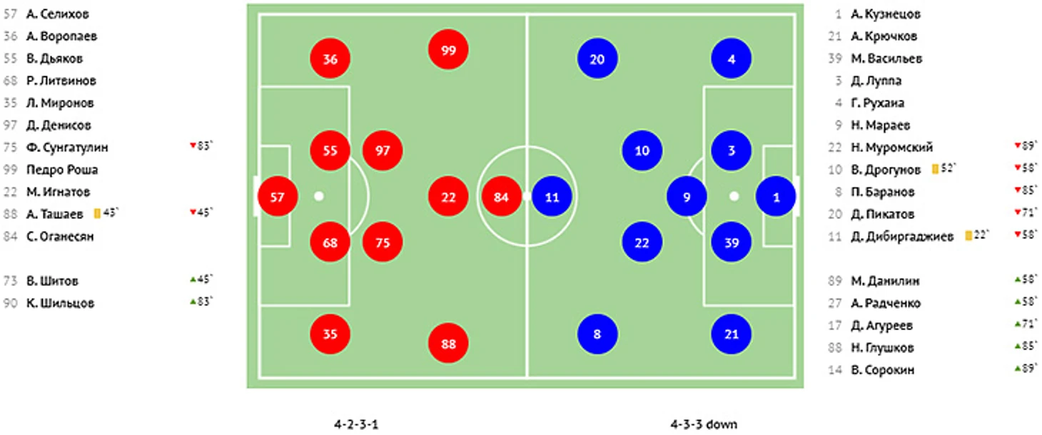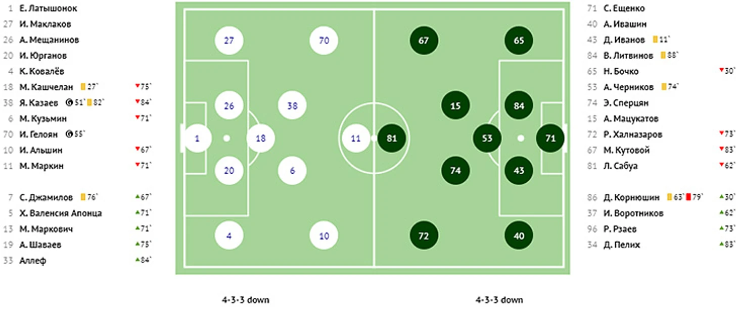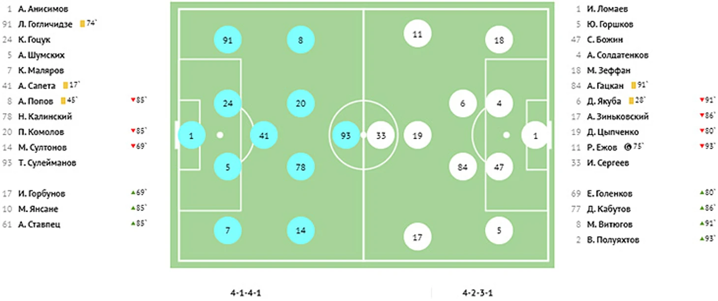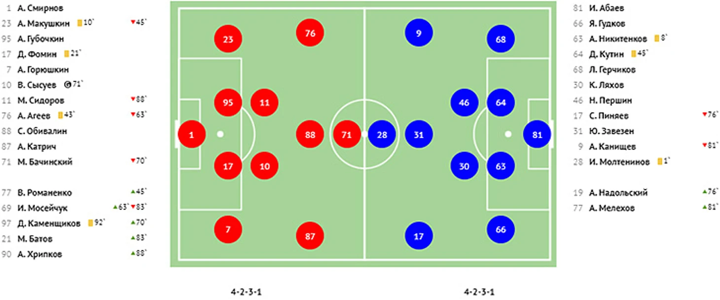Отлично игравший голкипер гостей Илья Абаев единственный раз капитулировал на 71-й минуте. Катрич обыграл справа в чужой штрафной на замахе Гудкова, вывернул навес немного левее от себя, ну а там в касание пробил Сысуев.