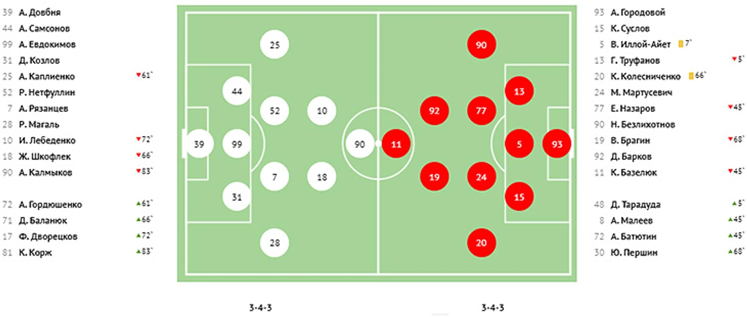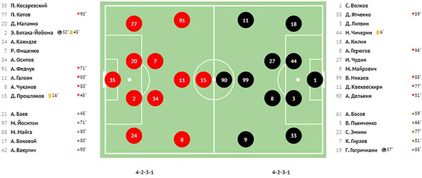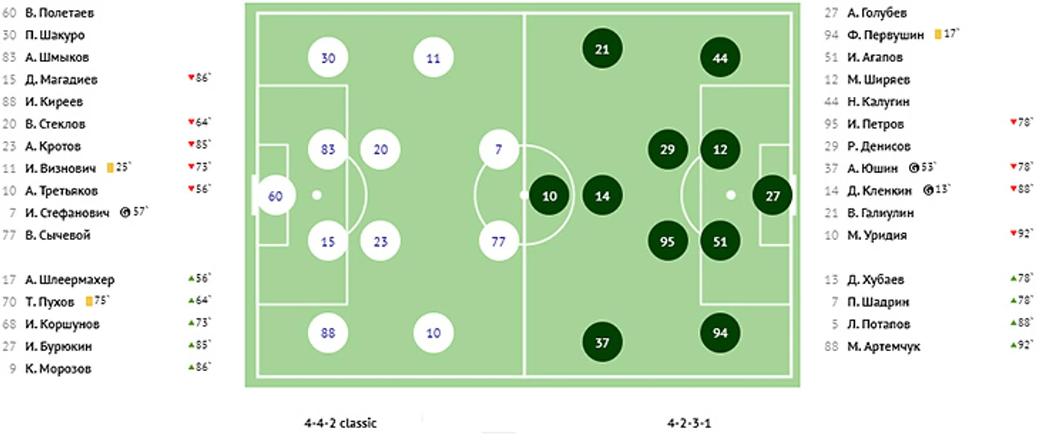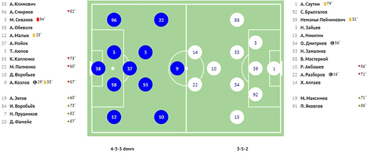 Отлично игравший голкипер гостей Илья Абаев единственный раз капитулировал на 71-й минуте. Катрич обыграл справа в чужой штрафной на замахе Гудкова, вывернул навес немного левее от себя, ну а там в касание пробил Сысуев.