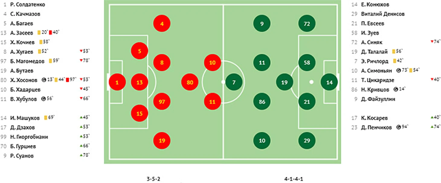 Голы: Хосонов, 14 (1:0). Кривцов, 15 (1:1). Хубулов, 57 - с пенальти (2:1). Симонян, 74 (2:2). Пенчиков, 90+ (2:3).