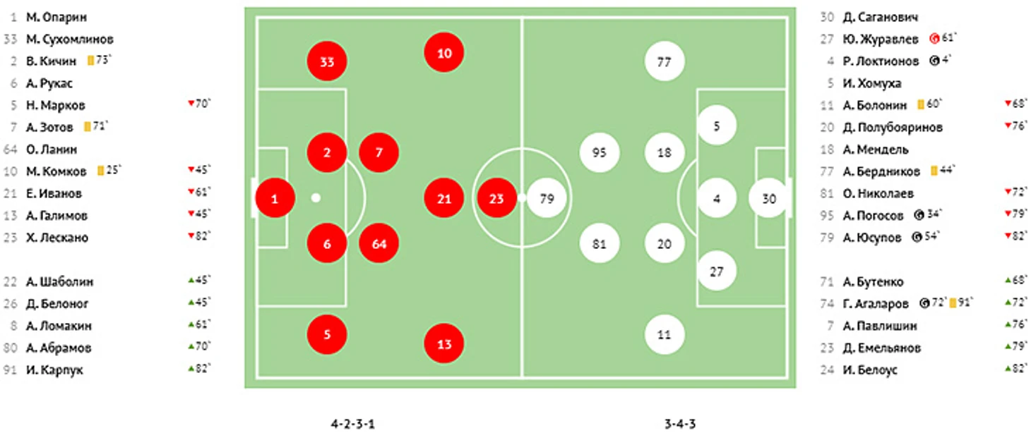 Голы: Локтионов, 5 (0:1). Погосов, 36 (0:2). Юсупов, 56 (0:3). Лескано, 62 (1:3). Агаларов, 73 (1:4).