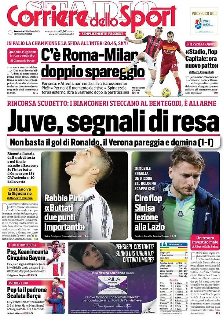 Каждая футбольная газета Италии, за исключением лишь «Il Romanista», вышла сегодня с одной и той же фотографией Роналду после неудачного мачта с «Вероной». Представляю вашему вниманию обложку «Corriere dello Sport»: