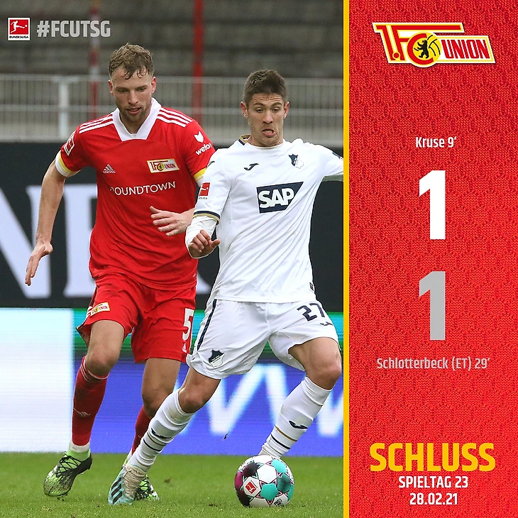 Во втором тайме «Хоффенхайм» вырвался вперед: отличился Павел Кадержабек, но мяч отменили благодаря VAR. Судьи увидели офсайд в самом начале атаки, поэтому счёт отмотали назад. На более «Хоффенхайм» уже не сподобился, потеряв боевой дух, а «Унион» старался не потерять хотя бы одно очко.