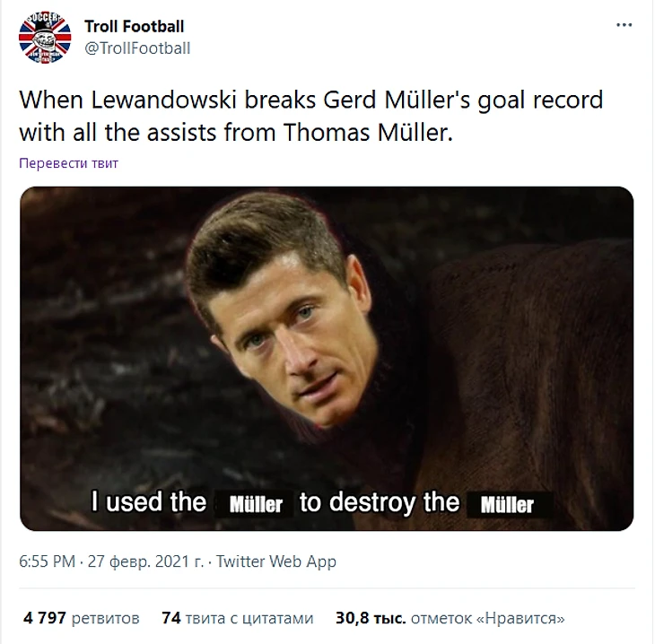 Левандовски, когда побьет голевой рекорд Герда Мюллера с передач Томаса Мюллера. На картинке: "Я использую Мюллера, чтобы уничтожить Мюллера".