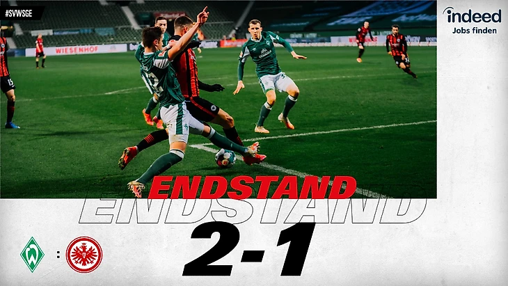 «Вердер» имел возможность сравнять счет со штрафного, но Милот Рашица угодил прямо во вратаря. Спустя пару минут Джош Сарджент, казалось бы, отправил мяч в ворота «Айнтрахта», но гол тут же отменили из-за офсайда. Ближе к концовке тайма еще один момент имел Рашица, но угодил в перекладину.