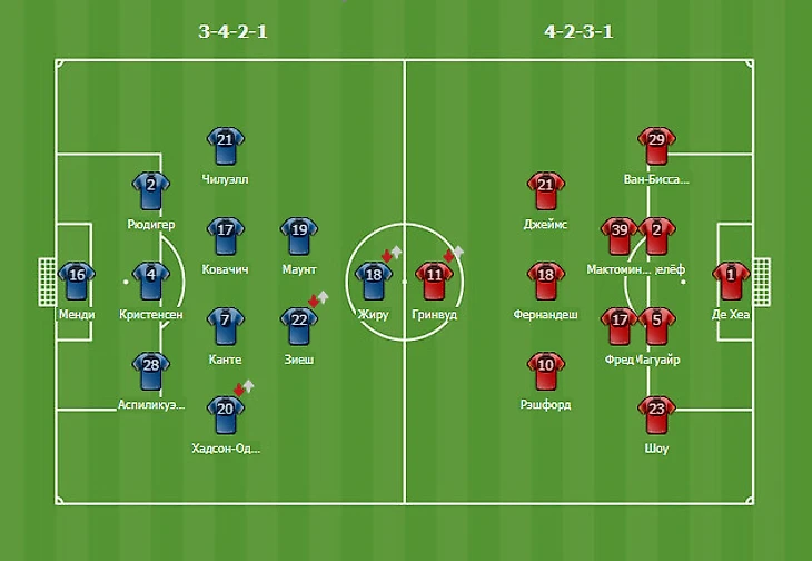 Стоит сказать, что Манчестер, несмотря на более выгодное положение в турнирной таблице, навряд являлся фаворитом игры: нестабильная игра в последних матчах, весомые кадровые потери (Кавани, Погба... Фил Джонс) и, хотя весьма не очевидный, но все-таки спад. "Пенсионеры" же, после смены главного тренера, проводят один из лучших отрезков за последние годы, сметая все на своем пути. Да и не только в Англии, но и Симионе попал под раздачу. То ли Тухель так вдохновил, то ли Лемпс так надоел, то ли еще что-то, но факт на лицо, а вернее на поле: мотор завелся -- колеса завертелись.