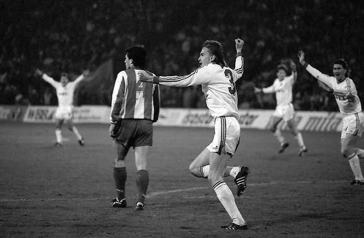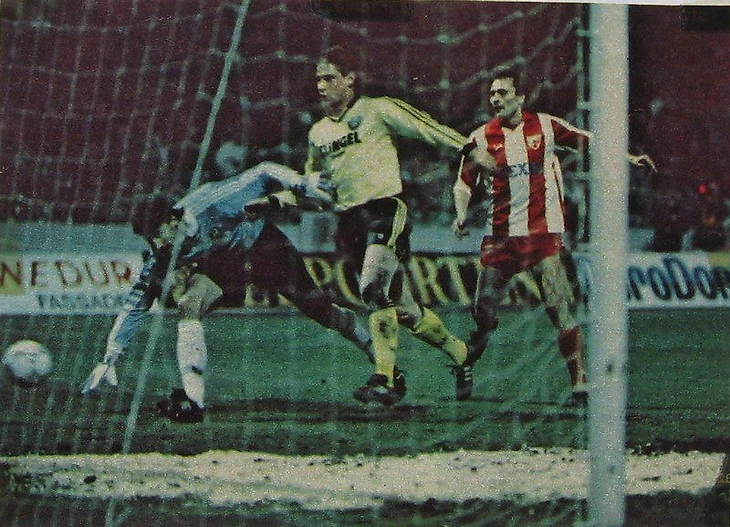 56 минута, с начала второй половины встречи прошло не так уж и много времени. Из глубины поля развивается очередное наступление Звезды, вперед идет Бинич. Слева от него оказывается Савичевич, которому адресуется короткий пас, вместо дальнейшей распасовки Деян просто бьет с левой в ближний от вратаря угол, и 3:0!!! Снова эпичнейший разгром, снова блистательный успех, теперь у Динамо еще больше проблем перед ответной встречей! Атаки гостей выглядят уже вконец беспомощными, а Рефик Шабанаджович опаснейшим образом бьет и чудом не забивает четвертый мяч... В конце, впрочем, Гютшов мог спокойно забивать после подачи углового, но его удар перед собой отбил Стоянович, перед тем отразив такой же удар прямо в себя головой и дважды спас, таким образом, белградцев от пропущенного гола! А звездаши оборотов не сбавляют, вот уже Панчев, получив у штанги соперника мяч, наносит два подряд удара в Кёлера.