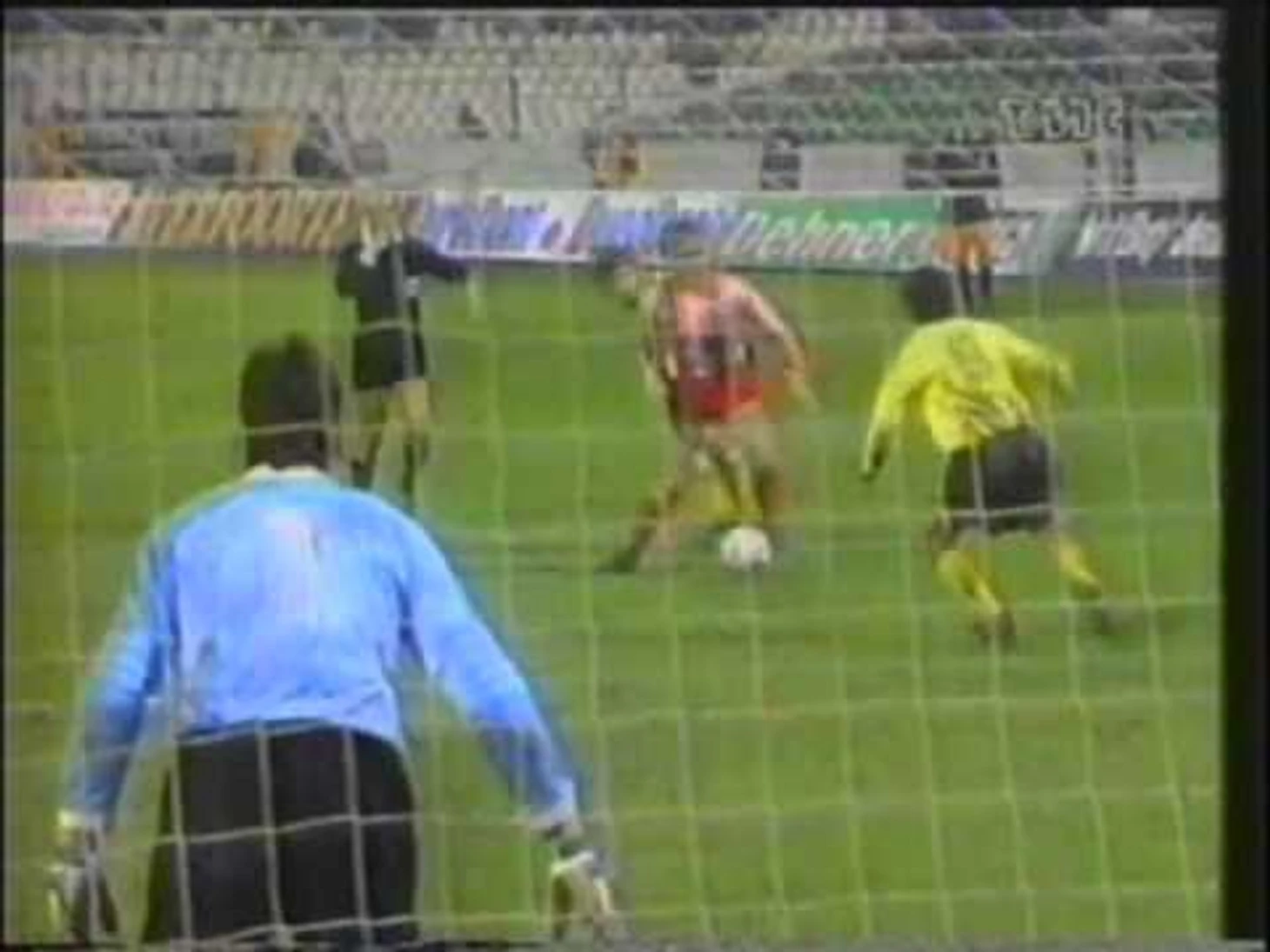 Первый тайм заканчивается, и кажется, что Бавария скорее забьет еще, игра опять сместилась на половину поля югославов. Но что это? Бинич летит по правому флангу, отправляет прострельный мяч на дальнюю штангу ворот Ауманна, а там внезапно оказывается Панчев, который, чуть замедлись, не успел бы к мячу - и счет сравнялся! 1:1, 45 минута игры, крутой, еврокубковый, породистый гол в раздевалку баварцам!