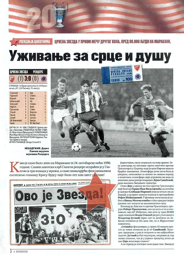 74 минута игры. В атаке игроки из Глазго. В своей штрафной подхватили мяч звездаши, примерно в центре поля мяч получает Панчев, оттягивает на себя двоих рейнджеров и отдает направо Биничу. Добежав до мяча, Славиша в касание подает в штрафную, а Панчев таким же образом, в касание, боком к воротам, отправляет и третий мяч в сетку ворот гостей! Все по сути решено, Звезда немилосердно выносит своего соперника, не давая ни единого шанса на спасение уже по итогам первой игры! И это без учета попадания Панчева в штангу, опасного удара Бинича! Счет мог быть и крупнее, чем 3:0, хотя и этого было в целом достаточно для уверенности в результате!