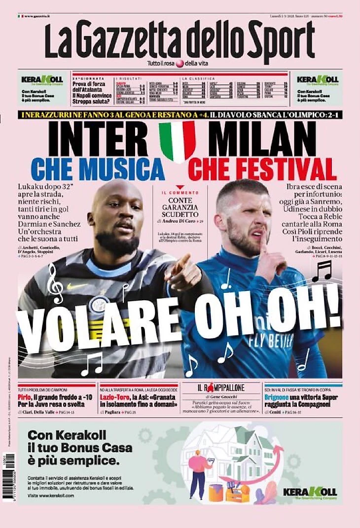 Volare oh oh! Заголовки Gazzetta, TuttoSport и Corriere за 1 марта