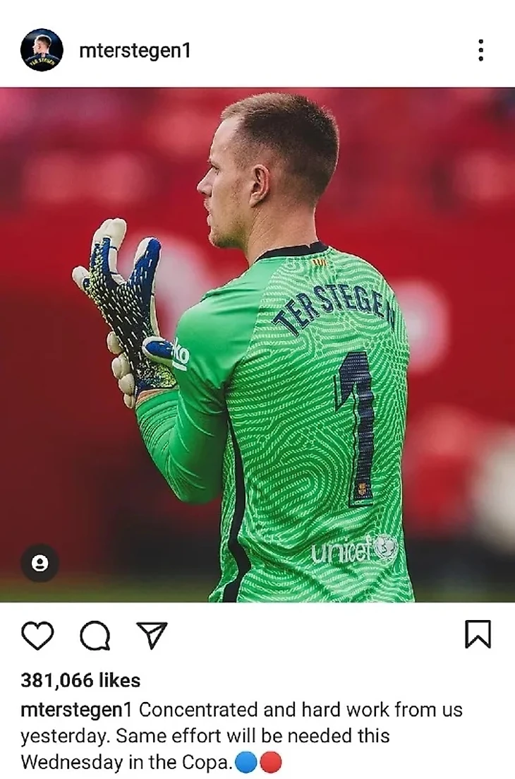 Марк-Андре тер Стеген разместил в Instagram свою фотографию с игры против «Севильи», подписав ее: «Вчерашняя концентрация и упорный труд. Такие же усилия потребуются и в эту среду в кубке».