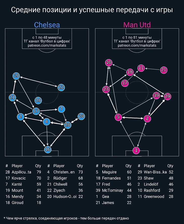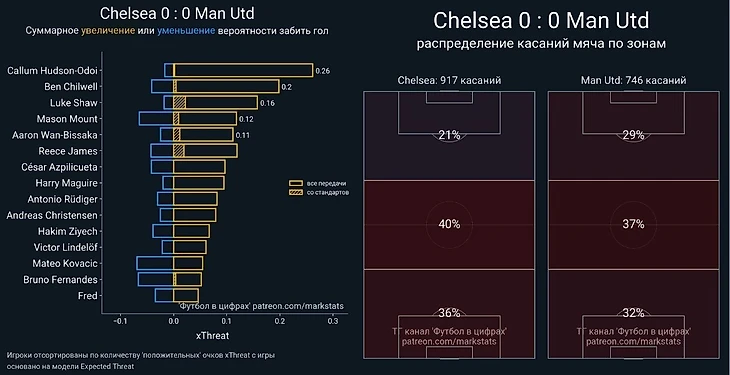 Хадсон-Одои, покинувший по всей видимости вынужденно, поле в перерыве, был одним из самых опасных игроков в атаке Челси. При этом именно на фланге Каллума Юнайтед трижды за первый тайм удачно отобрал мяч в прессинге. Заменил же его Рис Джеймс, который добавил в продвижении мяча, но сделал игру хозяев более осторожной, что отражают цифры о касаниях мяча по большей части в центральной зоне и в линии обороны "пенсионеров".