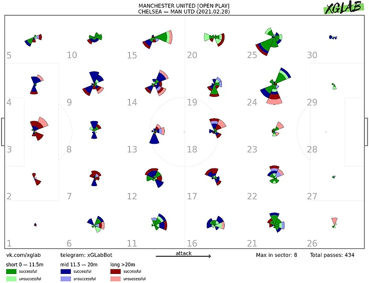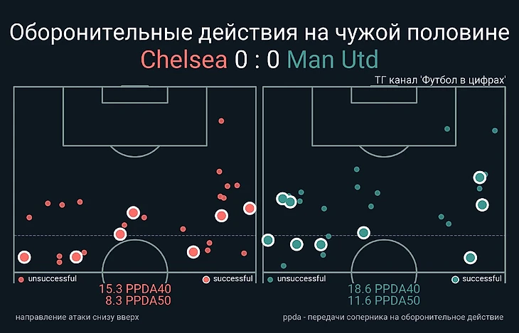 Встретились 2-ая (Челси: PPDA 8,72) и 6-ая (МЮ: PPDA 10,60) команды чемпионата по активности в прессинге. Примечательно, что Юнайтед большую часть игр проводит против более слабых соперников, потому показатель такой хороший. Против Сити, Ливерпуля и Челси в первом круге Сульшер полностью отказался от активной обороны впереди, потому данная статистка по прошедшему матчу крайне показательна с точки зрения характера игры.