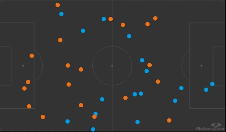 По сонару передач можно увидеть почему. В зонах 20 и 16 почти все короткие передачи были неточными. Люк и Аарон были активно заняты в высоком прессинге латералей Челси и сил на четкое созидание им просто видимо не хватило, особенно с учетом постоянно сдвоенного фланга в схеме 3-4-3.