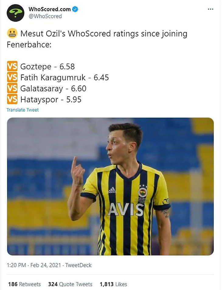 Кристоф Даум, бывший тренер «Фенербахче», сказал несколько недель назад в «Бильде», что Турция станет испытанием для Озила. Только теперь он сможет увидеть, каково это - иметь двух парней на своей спине в матче. В проигранном дерби «Галатасараю» (0: 1) он вышел со скамейки запасных. Озил отыграл только две игры в стартовом составе, и турецкие эксперты в один голос твердят, что он получит ПМЖ на скамейке запасных. WhoScored.com недавно разместили пост в Твиттере, где жестоко резюмировал игру Озила примечаниями. Месут сыграл пять матчей в Турции, и в каждой из них он получил оценку около 6,00, что есть очень плохо. (Фанаты "Футбольного менеджера", давайте вспомним, что мы делаем в игре с такими игроками...)