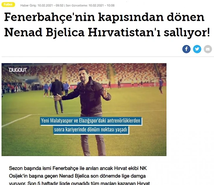 Тренер Эрол Булут говорит, что 32-летнему игроку нужно время, хотя, видится, что его у Озила нет, потому что Булут вот-вот потеряет работу. Месяц назад «Фенербахче» лидировал в Суперлиге. Было сказано, что впервые с 2014 года у него есть отличные шансы на победу в чемпионате. Они, конечно, все еще существуют, но после недавнего поражения от «Гезтепе» (0: 1) говорят, что только спортивный директор Эмре Белозоглу чудом сохранил работу тренеру. Али Коч сильно сожалеет, что идея с приездом Ненада Бьелица этим летом не удалась. Хорват снова в заголовках турецких сайтов. Скорее в режиме сожаления, чем в реальных обещаниях.