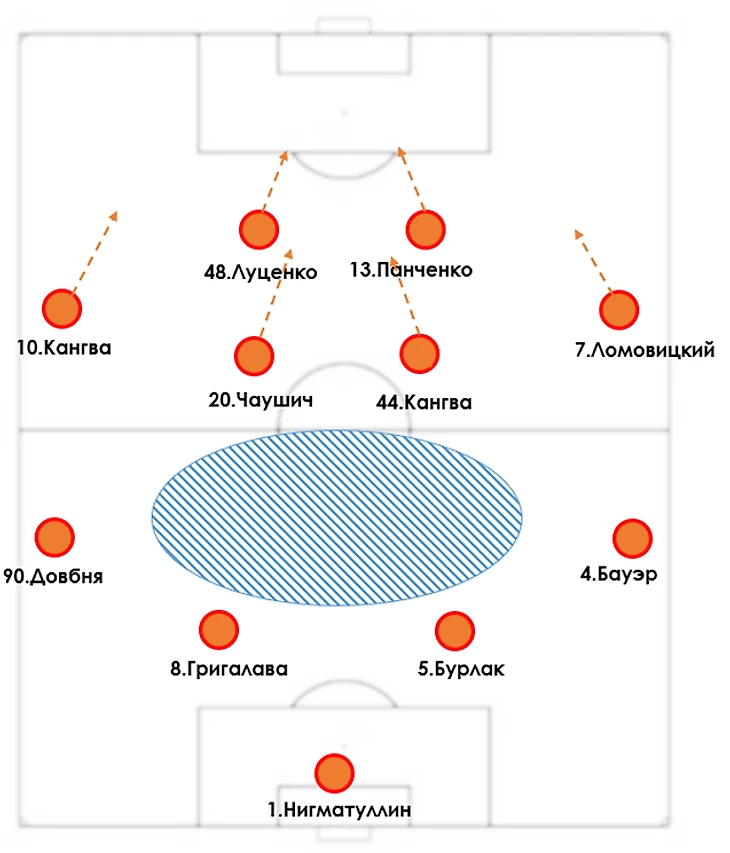 При позиционной обороне Довбня постоянно выдергивался за инсайдом. Если в первом тайме Кангва еще успевал подстраховывать Довбню, то с выходом Горбатенко фланг сильно «исхудал».