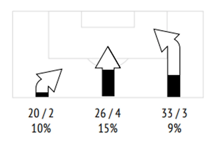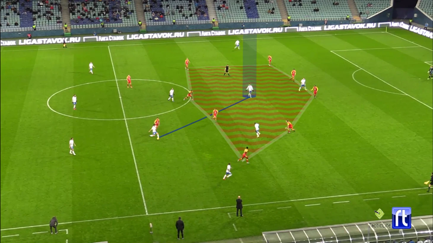 Приняв мяч, у Юсупова появляется сразу несколько вариантов развития атаки. По большому счету, данная передача отрезает сразу же 6 игроков «Арсенала».