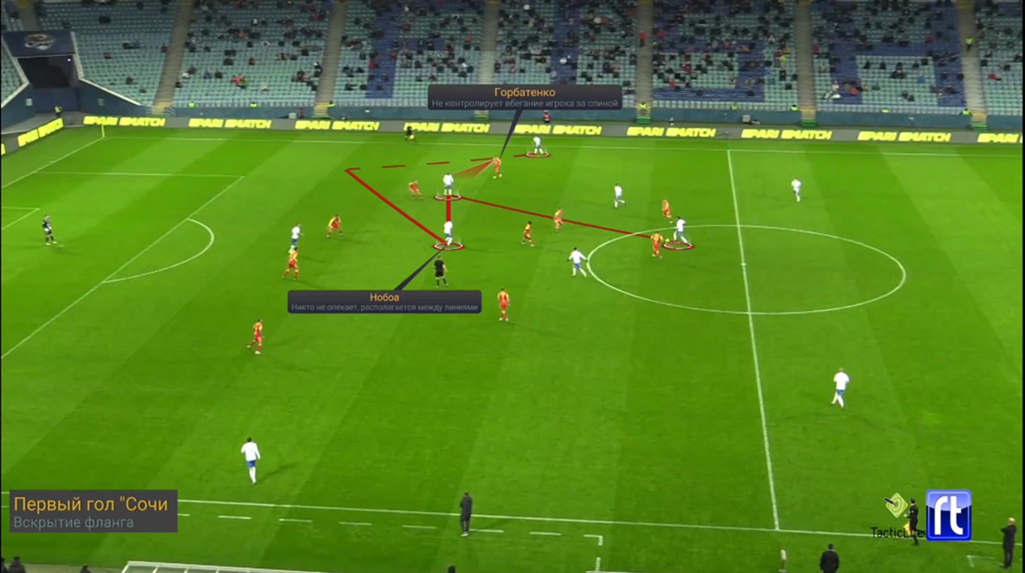 В результате образовывалась зона между линей прессинга и линей защиты, через которую сочинцы старались развивать все свои атаки. По ходу матча можно заметить, что в данной зоне постоянно находился игрок без опеки.