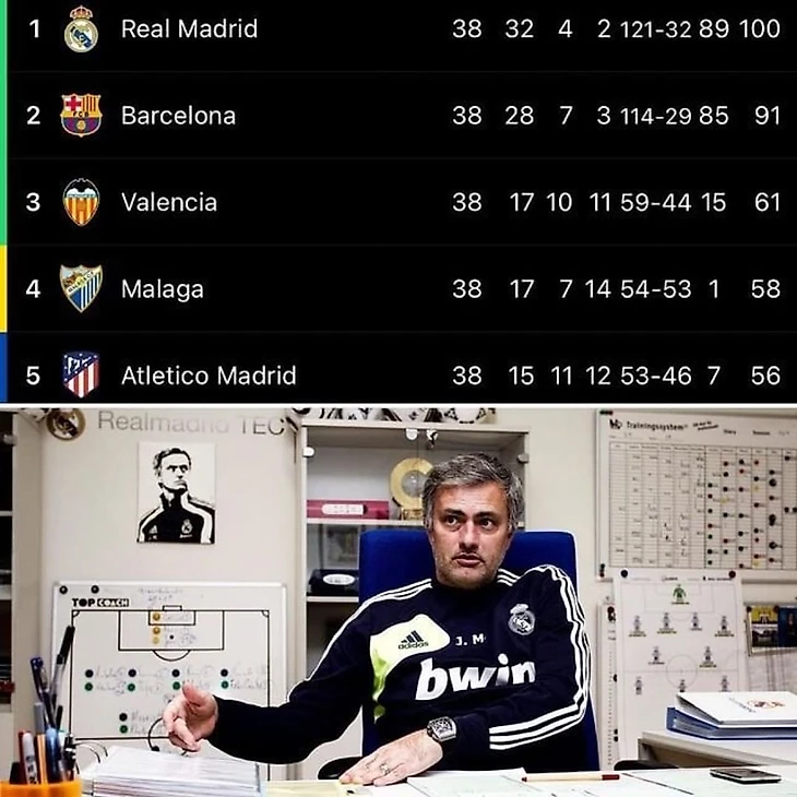 Состав «Королевского клуба», который установил 4-е рекорда в истории Примеры: количество очков (100), побед (32), забитых мячей (121, актуален по сей день) и разность забитых/пропущенных (89)