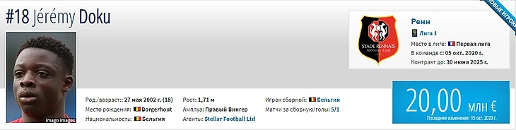 Ренн заплатил за Доку очень приличные 26.000.000 евро и явно видит в нём потенциал к росту и дальнейшей перепродаже за большие деньги. Осенью 2020 Жереми дебютировал за национальную сборную Бельгии и уже провёл за неё 5 матчей и отличился одним забитым мячом в ворота сборной Исландии. Главное спортивное медиа Франции L’Equipe включило Доку в список 50 самых талантливых футболистов мира родившихся после 1 января 2001 года. Из сильных его сторон конечно выделяется скорость, техника и дриблинг.