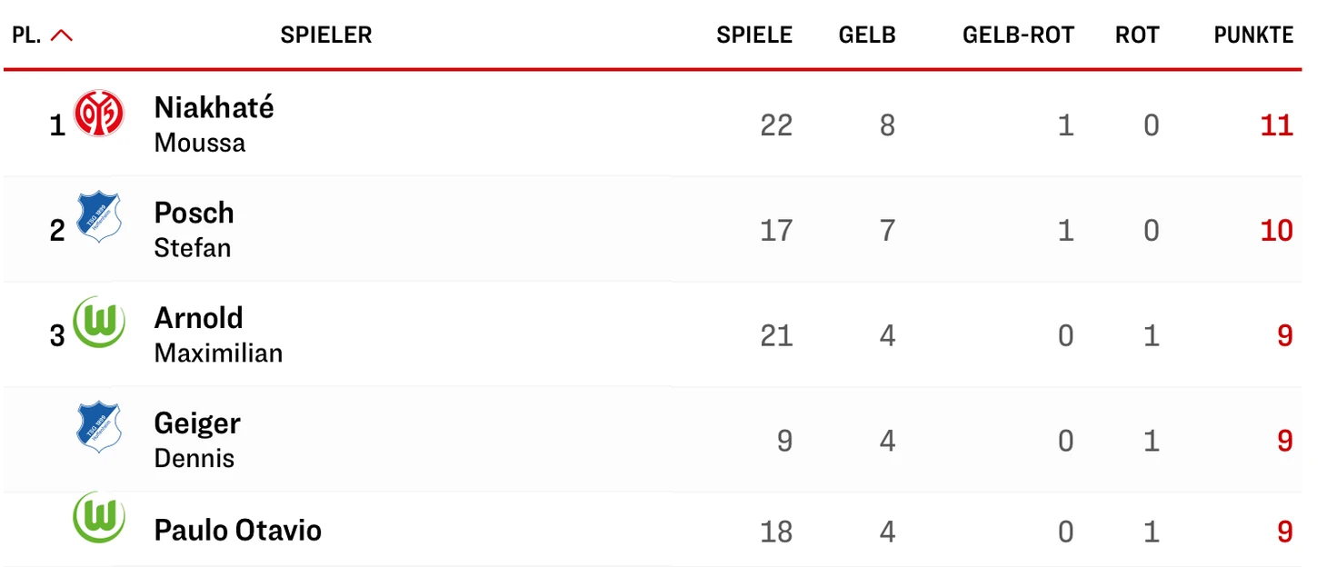 *игрок – кол-во игр – желтые – 1+1 желтые – красные – всего
