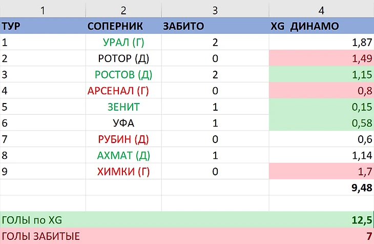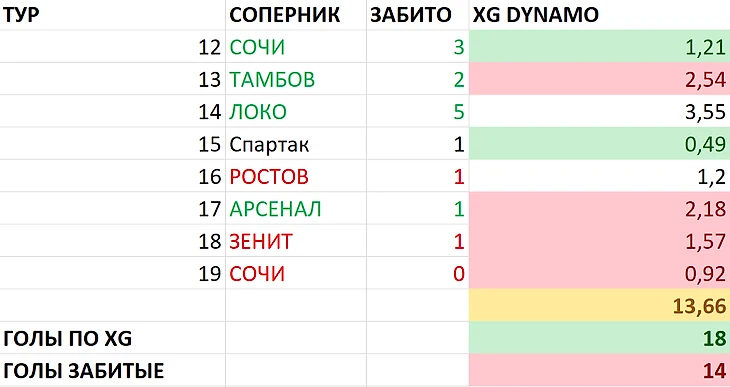 Можно сказать, что Новиков нивелировал это сверхудачной игрой с теми командами, которые не позволили создать у своих ворот никакой остроты, однако Динамо забивало и даже выигрывало (наиболее явный пример - это "Зенит"). Можно сказать и так. Эти матчи, в которых количество голов значительно превышает остроту созданных моментов, выделены в таблице зеленым.