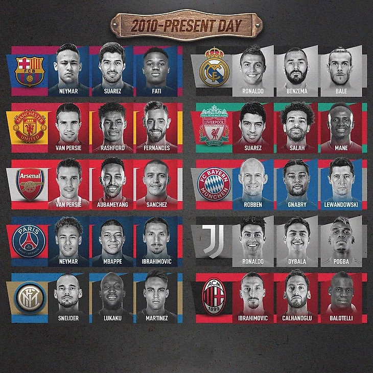 Сразу подчеркну, некоторые игроки не пересекались в одно время, в одном клубе (например: Ромарио и Роналдо, Кантона и Йорк), особенно это касается третьего коллажа — фантазия авторов официального Twitter-аккаунта Sport360°