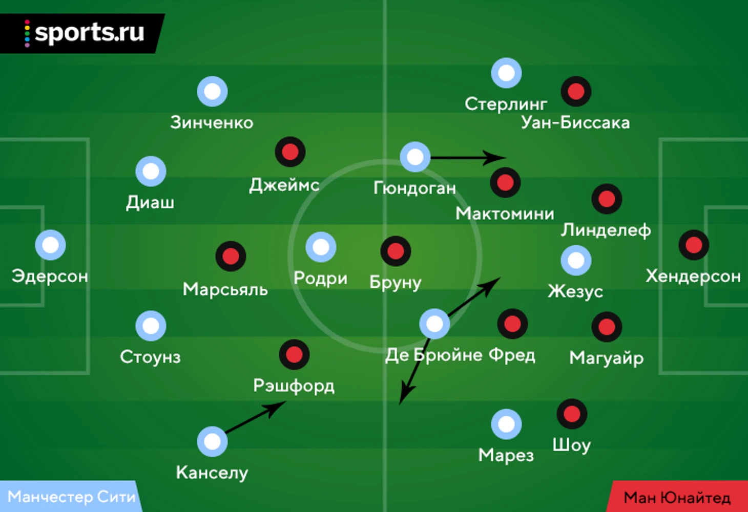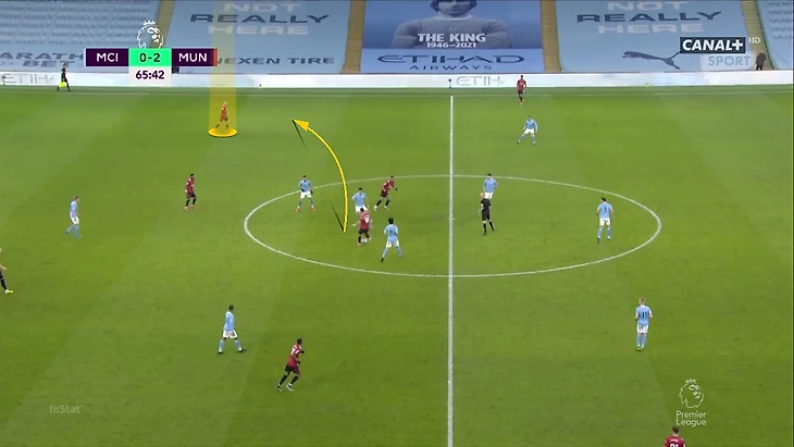 После матча Пеп похвалил «Юнайтед» именно за прессинг – назвал его невероятным и очень-очень высоким. Правда, один из его тактических сюрпризов сыграл на руку «МЮ». В первые 15-20 минут очень узко играл Де Брюйне – выходивший на его позиции Бернарду обычно смещается во фланг и усложняет прессинг сопернику. Такое расположение КДБ облегчало задачу «МЮ» – опорникам не приходилось покрывать слишком большое расстояние. Замыкать прессинг было легче: