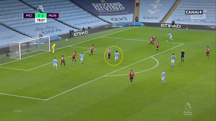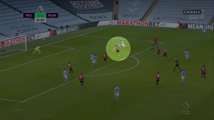 Результат такой игры – предпоследний результат Кевина по касаниям в первые 20 минут. Последний – у Рияда Мареза. Необычное расположение КДБ вредило в первую очередь алжирцу. Он оставался без поддержки, тем более что по Канселу дисциплинированно играл Рэшфорд. Но затем Кевин вернулся к привычному типу открываний. «МЮ» пришлось отойти назад: