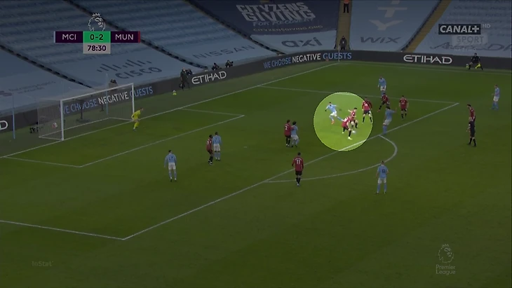 Ключевая угроза от бельгийца – любимое движение с перегрузом фланга и кроссом в штрафную. Они получаются у Кевина даже в плохой форме. Вчера в его открываниях была дополнительная логика. Так как Мактомини следил за Гюндоганом, Фред страховал опорную (хотя его одного там все равно было недостаточно) – успеть и в штрафной, и на фланге бразильцу было проблематично. КДБ этим явно пользовался.