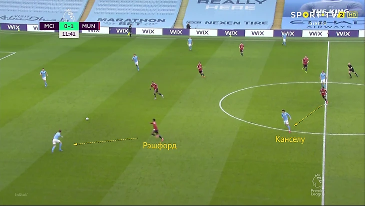 Особенно интересной в прессинге была позиция Маркуса Рэшфорда. Его соперник по схемам – Жоау Канселу. Без мяча португалец действует на фланге, но при розыгрышах смещается в опорную зону и становится дополнительным полузащитником. Рэшфорд адаптировал свою позицию, ориентируясь именно на это движение.
