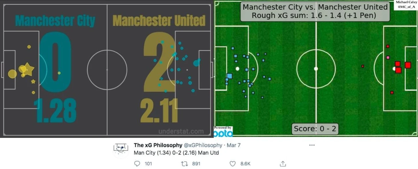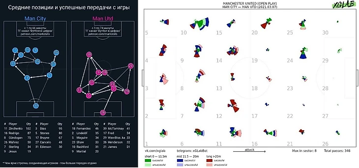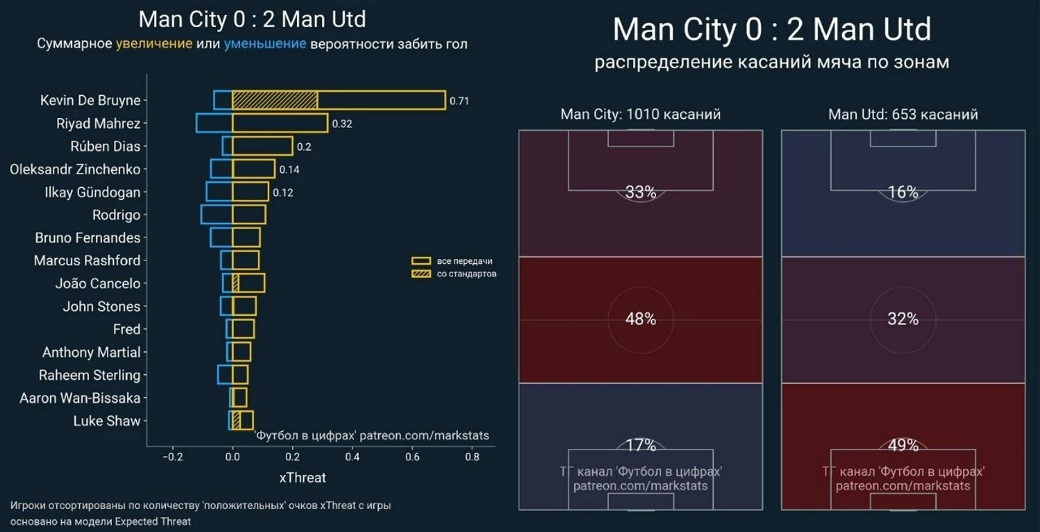 Прекрасно) Юнайтед заставил Сити побыть в своей прошлогодней шкуре. Множество ударов, но с не самых опасных и очевидных позиций. Некоторые сетуют на то, что xG не засчитывает удары вроде тех, что не случились у Стерлинга, но ведь это же бред. Если Гвардиола пошел на такой шаг, когда Рахим начал действовать на острие атаки, то он заранее принял двоякость выбора. Стерлинг реализует очевидные моменты настолько же плохо, насколько это не делает Рэшфорд. К тому же Рахим хорош при атаках сходу, когда он наносит удар засчет инерции своего тела, но вот акцентировано наносить удар из статики после прострела, как центрфорвард, он не умеет.