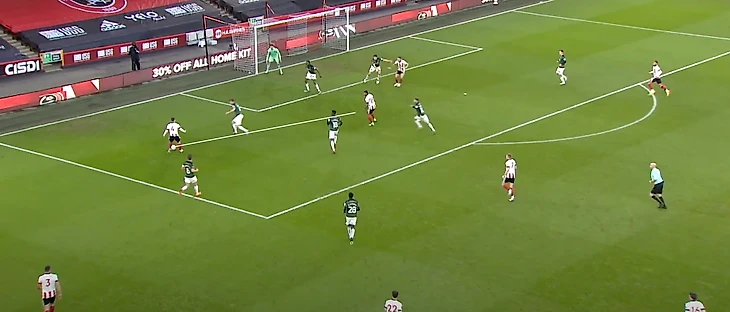 Складывается ощущение, что Райан всё ещё не проникся футболом Криса Уайлдера - постоянные подключения центральных защитников и винг-беков с целью созданию численного перегруза. В этом моменте Брюстер не понял до верного отточенный прием Стивенса - игра в стеночку. Вместо того, чтобы одним касанием вернуть Стивенсу мяч в зону, куда он целенаправленно врывался, Брюстер в несколько касаний затормаживает атаку и переводит мяч на другой фланг, к тому же еще и неудачно.