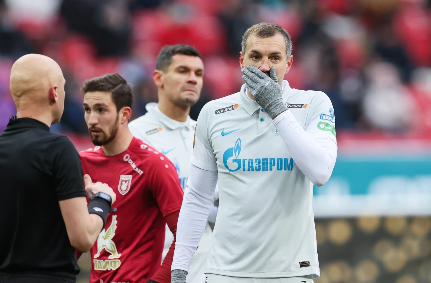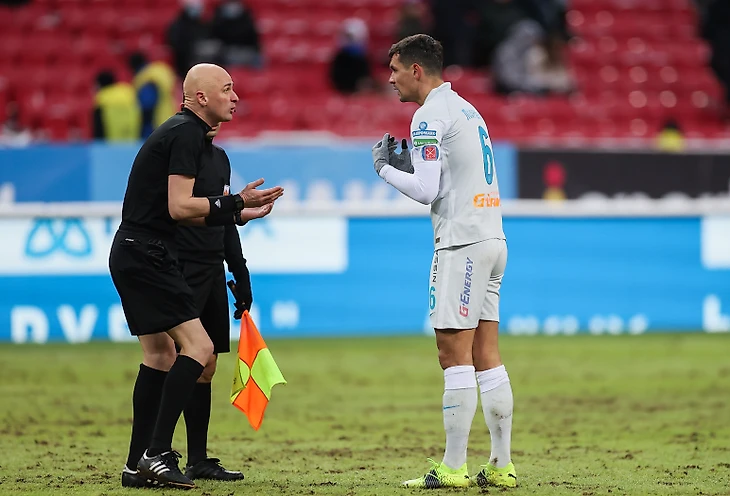 Ключевой эпизод тайма – это пенальти в ворота «Зенита». На 36-ой минуте мяч отлетел в руку Далеру Кузяева от ноги игрока "Рубина". Арбитр Сергей Карасёв очень долго изучал повтор. В итоге пенальти был назначен, руку Кузяева посчитали в неестественном состоянии.