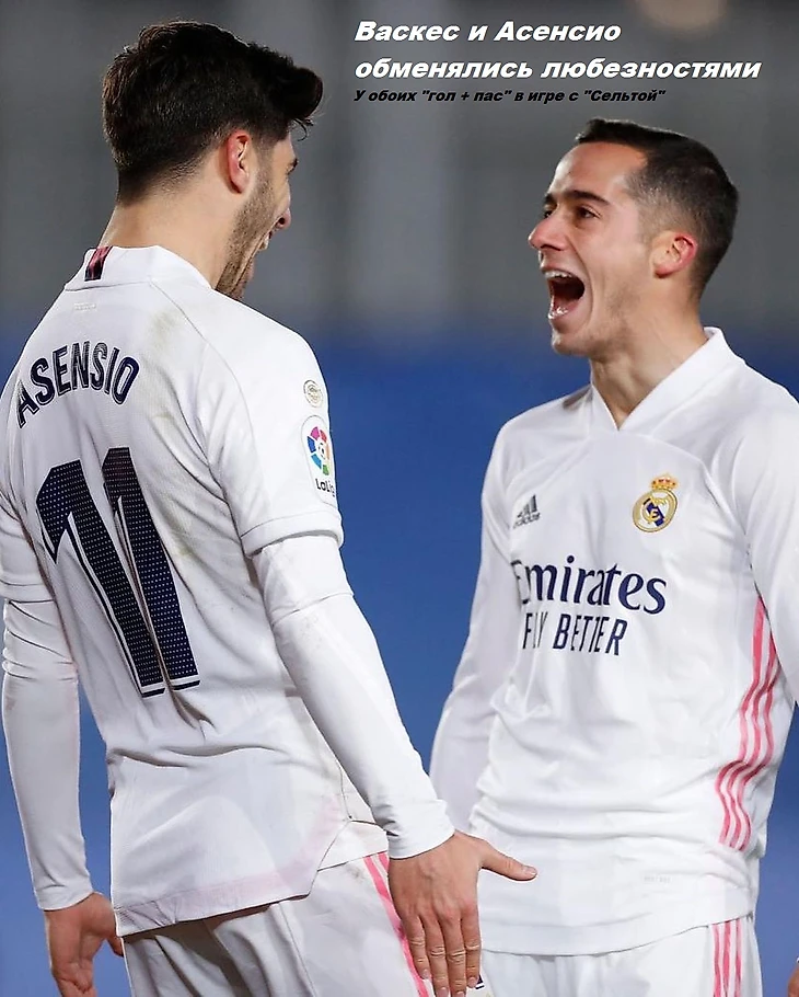 Кто знает, как сложился бы этот матч, реализуй Яго Аспас хороший момент на пятой минуте. Начо вынес летящий в ворота мяч, когда Куртуа, их покинувший, был уже бессилен помочь. Но не пропустив, Мадрид тут же забил сам. Асенсио отдал хороший пас Васкесу, Лукас был безупречно точен. Во втором тайме он ответит партнеру тем же самым, и уже Асенсио забьет, а Васкес заработает в свой актив голевую передачу. Два героя игры. Выбирай на вкус. И мой выбор – в пользу Васкеса. Хотя бы на том основании, что его гол был первым и победным. Карим Бензема во втором тайме, кстати, имел все шансы сделать счет крупным, но оказался самую малость неточен.