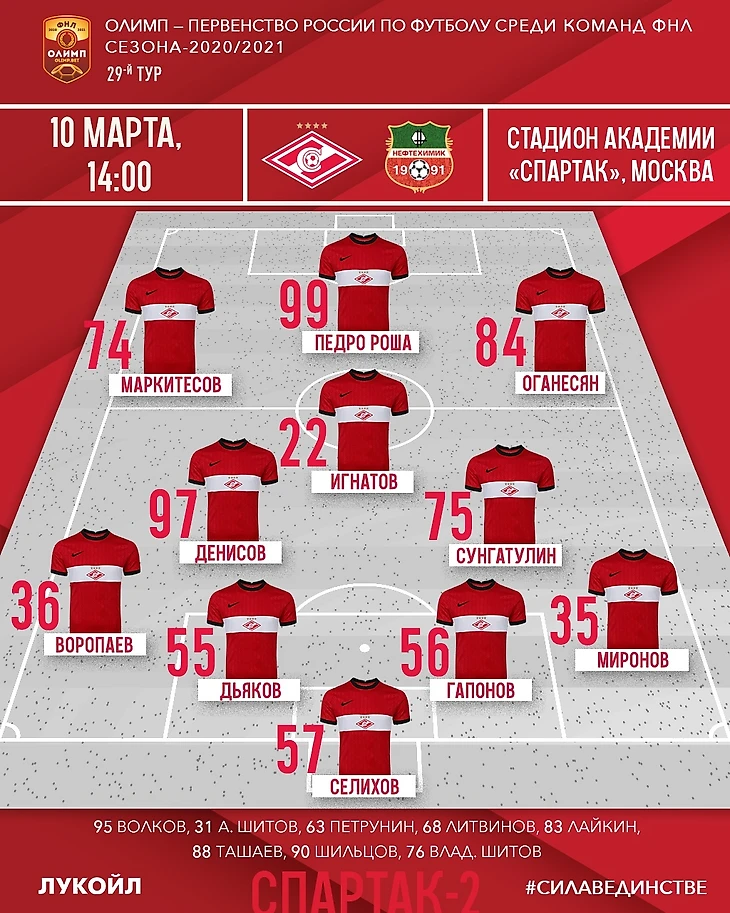 Следующий матч. В воскресенье, 14 марта, «Спартак-2» проведет гостевой матч против московского «Велеса». Встреча пройдет в подмосковном Домодедове, начало — в 14 часов.