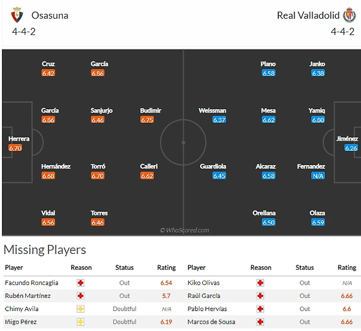 Что касается хозяев поля, то они тоже ожидают приятного пополнения. На днях прошла новость о том, что Чими Авила(7) наконец-то оправился от разрыва крестов и в ближайшее время будет готов помочь своей команде. Однако в заявку памплонцев на этот тур Чими все таки не попал как и Роберто Торрес(6,5), Унаи Гарсия(5) и Ойер(6). Трое последних юнитов не доступны тренеру из-за контакта с ковидоположительным персонажем.