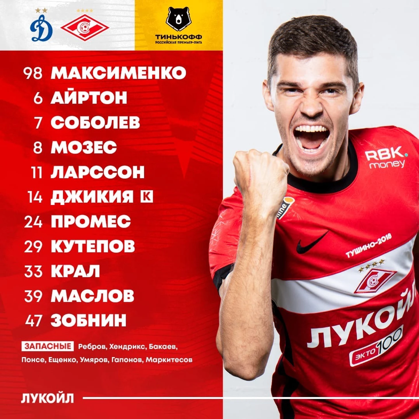 С первых минут за «Спартак» сыграют: Максименко, Мозес, Маслов, Джикия (к), Кутепов, Айртон, Зобнин, Крал, Промес, Соболев, Ларссон.