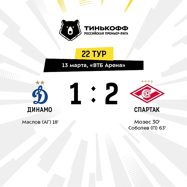 «Спартак» одержал победу над «Динамо» - 2:1 и вышел на второе место в чемпионате.