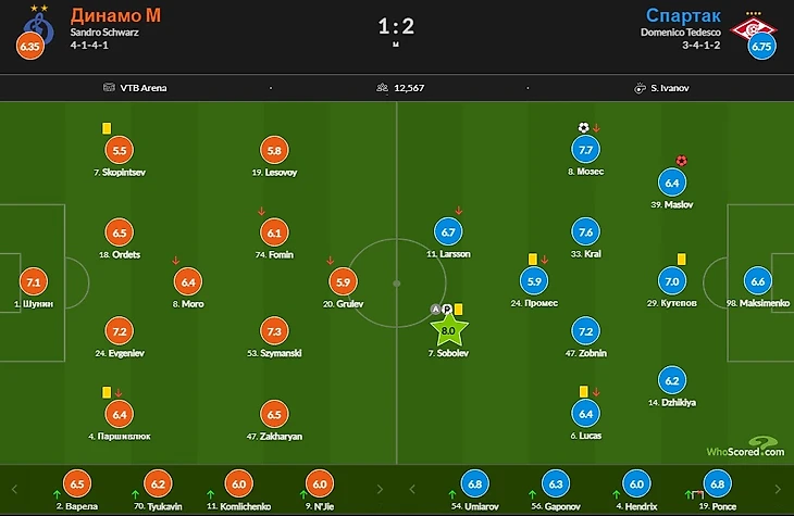 15. Главный герой матча – Александр Максименко. Его феноменальная игра принесла три очка «Спартаку». «Динамо» имело несколько убойных моментов, но голкипер выполнил свою задачу по спасению ворот. Но не меньшая заслуга в победе у Александра Соболева. Его нацеленность на борьбу, работа в прессинге и постоянное движение между линий по совместительству с 1+1 заставляет восхититься нападающим «Спартака».