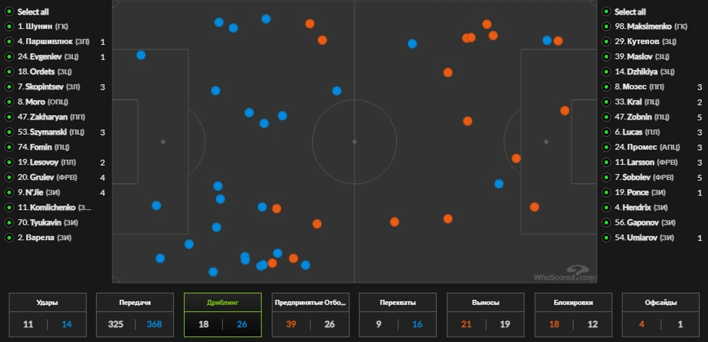 6. Несмотря на то, что в составе «Динамо» находится качественный дриблёр Лесовой, молодой и настырный Захарян, «Спартак» больше шёл в обводку – 18 попыток против 26.