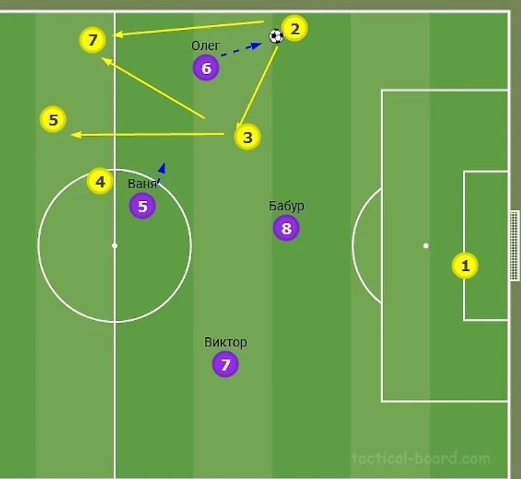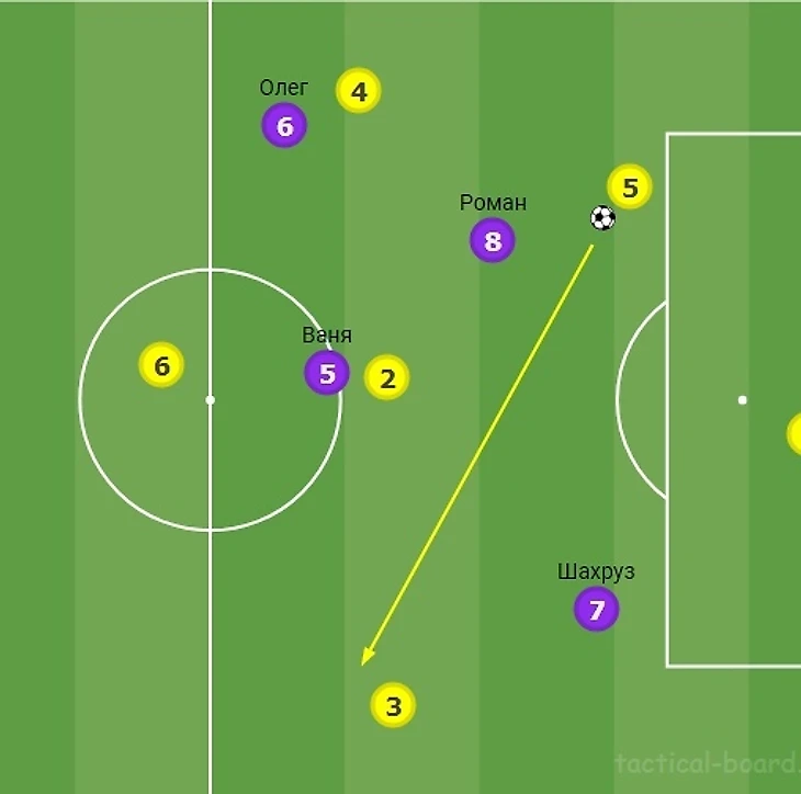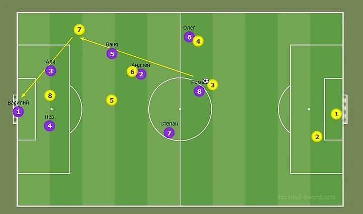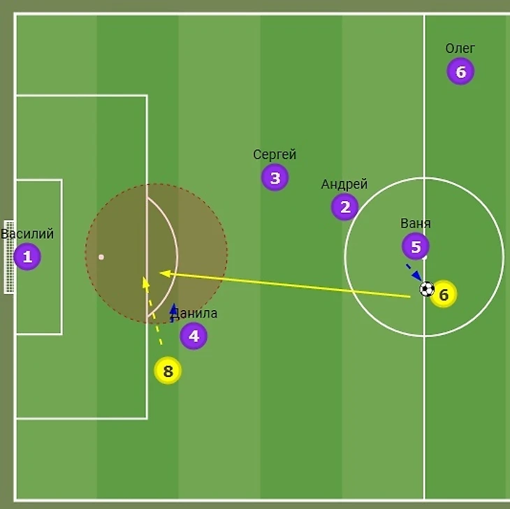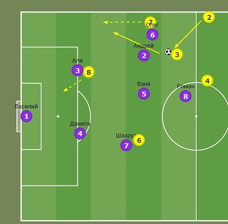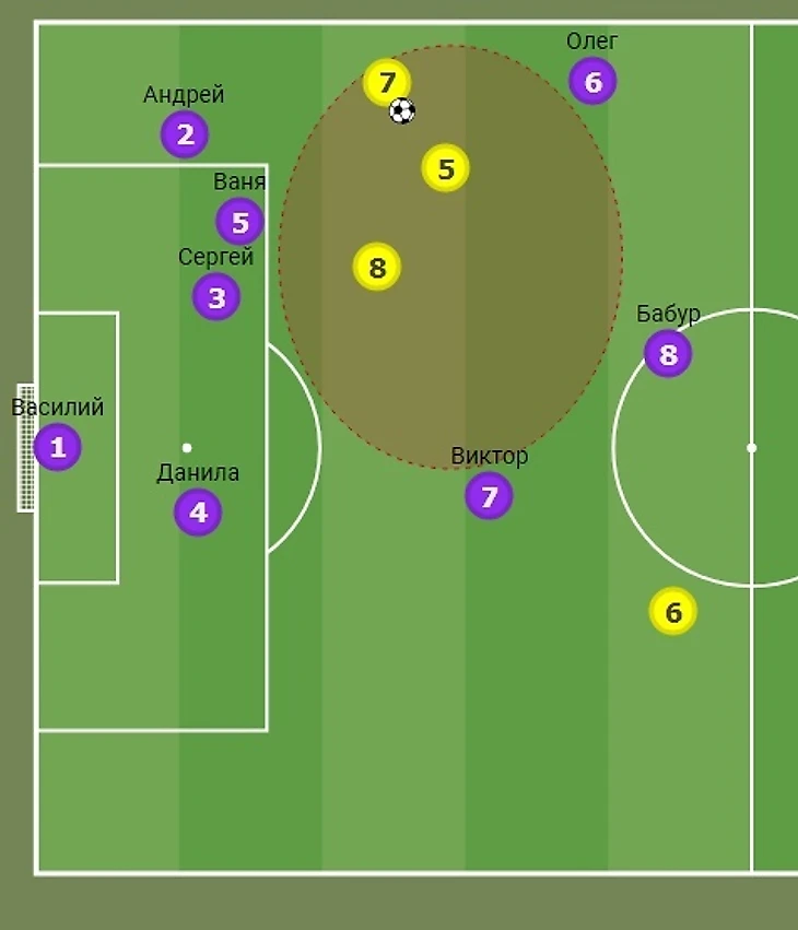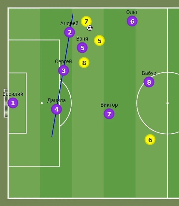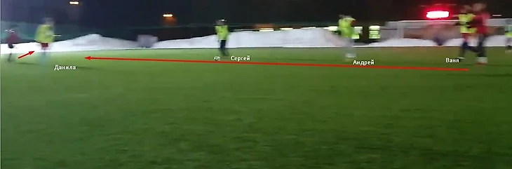 Андрей встречает правого полузащитника, в случае его ухода в центр там может встретить Ваня, который уже будет перекрывать пас на форварда и готовым прессинговать оппонента под 5 номером. Сергей же страхует обоих, мы снова видим прямую Андрей, Сергей, Данила.