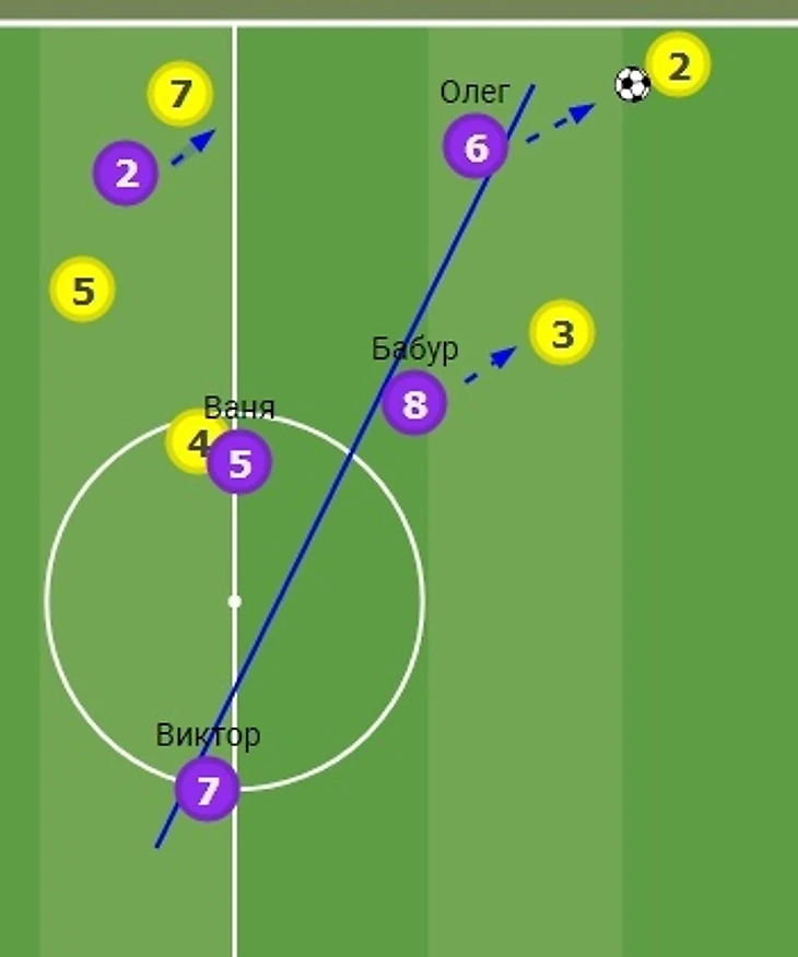 Вот так должен был выглядеть в подобной ситуации высокий прессинг нашей команды, да и любой которая себя уважает. Олег, Бабур и Виктор должны быть расположены по этой прямой линии с небольшими отклонениями (это нормально всё-таки в футбол играем а не геометрией занимаемся) Ваня во втором оборонительном «слою» и левый защитник (в тот момент был Андрей) должен подняться и заполнить зону Олега, ещё желательно чтобы цз подтянулся повыше (на кадр не попадает).