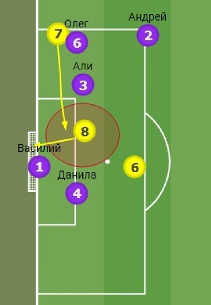 Справедливости ради стоит отметить что Олег успел развернутся и догнать соперника, но перехватить его последующий пас уже было крайне тяжело, Али правильно выдернулся в сторону прорыва соперника бросив своего оппонента, а Данила не среагировал на это и не заполнил зону центрального, как итог огромная дыра и расстрел ворот.