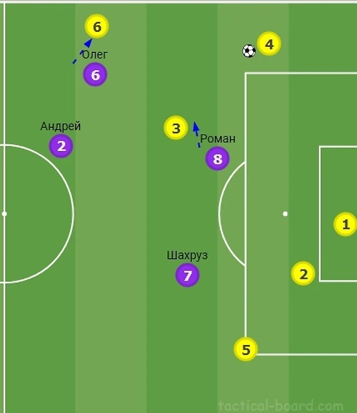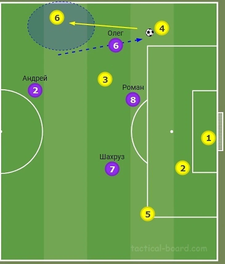 Олег правильно поднялся, Роман +- тоже норм, Шахруху необходимо было правее и глубже. И правому защитнику поджать 85 номера соперника. Как итог весь атакующий блок нам отрезают одним пасом.