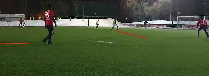 Поэтому в этой ситуации Олегу не стоило выбрасываться в агрессивный прессинг, а занимать свою зону согласно принципам компактности. В таком случае у соперника оставалось бы два варианта: либо выбивать вперёд либо играть через дом