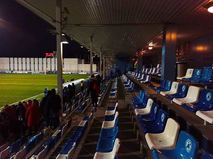 Стадион "Смена" новый стадион, построенный для молодежной академии ФК "Зенит". Сейчас здесь ещё и женская команда играет. Сам по себе стадион не плохой, довольно уютный. Очень сильно напоминает современные английские стадионы команд верхнего эшелона Нон-Лиги. Из недостатков выделил бы через каждые 10 метров мешающие обзору столбы, которые держат крышу, а также отсутствие внятных трибун за воротами...