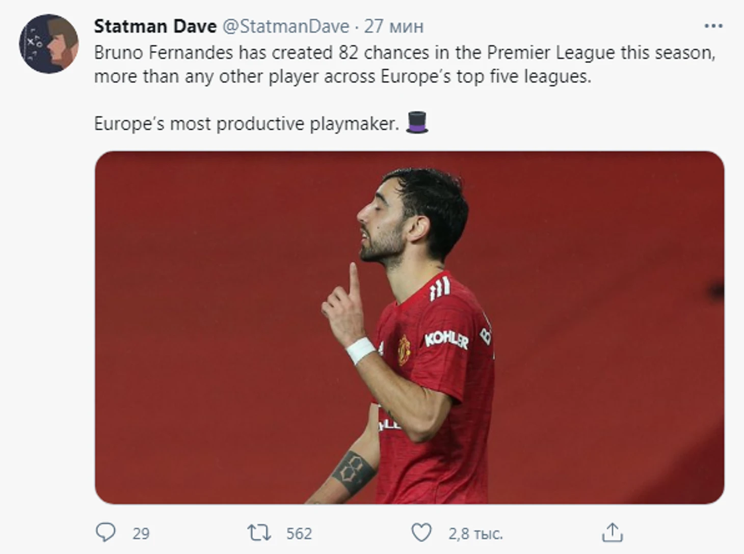 В сезоне 2020/2021 игрок Манчестер Юнайтед Бруно Фернандеш создал 82 момента у ворот соперников своей команды, что является самым высоким показателем среди ТОП-5 чемпионатов Европы.
