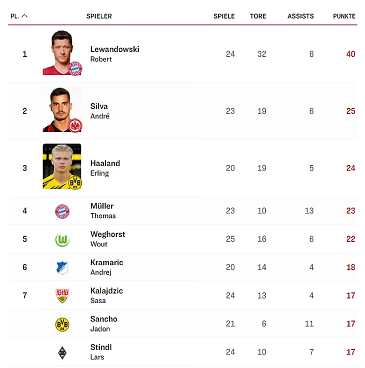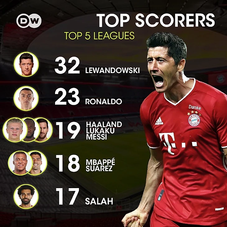 Робер Левандовски неудержим: на картинке лучшие бомбардиры топ-5 лиг и количество забитых голов.