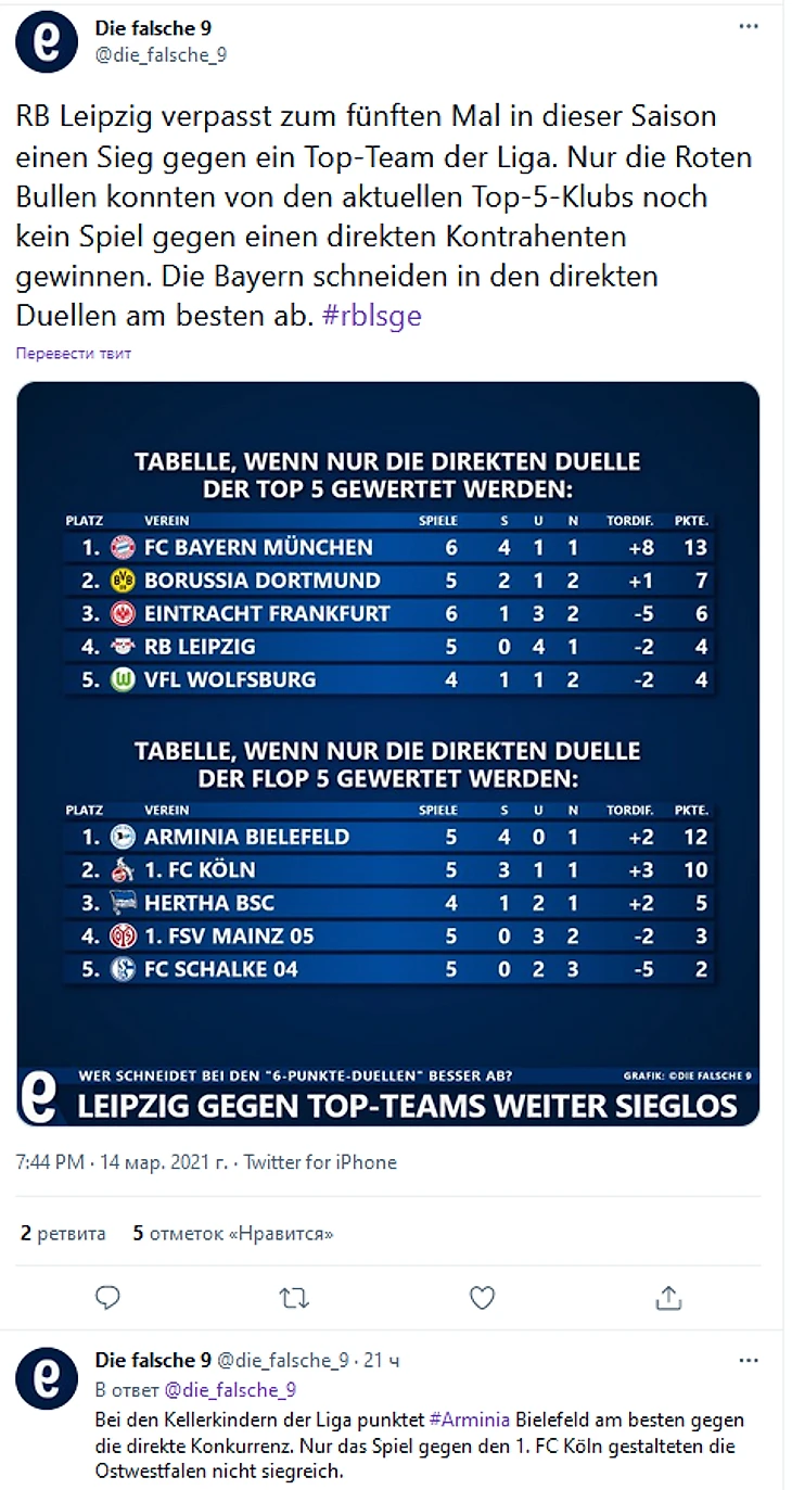 «РБ Лейпциг» в пятый раз в этом сезоне упустил победу против прямого конкурента. «Быки» единственные, кто в этом сезоне ещё не выигрывал у команды из актуальной пятерки лучших. «Бавария» в таких встречах проявляет себя лучше всех. В подвале таблицы лучшая «Арминия», они проиграли только «Кёльну».